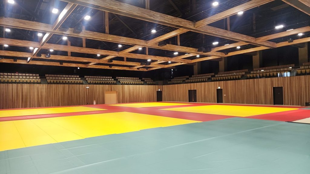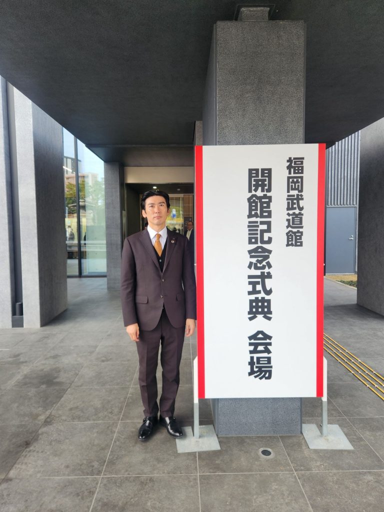 県庁議会棟の目の前に、大濠公園から移設された武道館の開館記念式典へ。