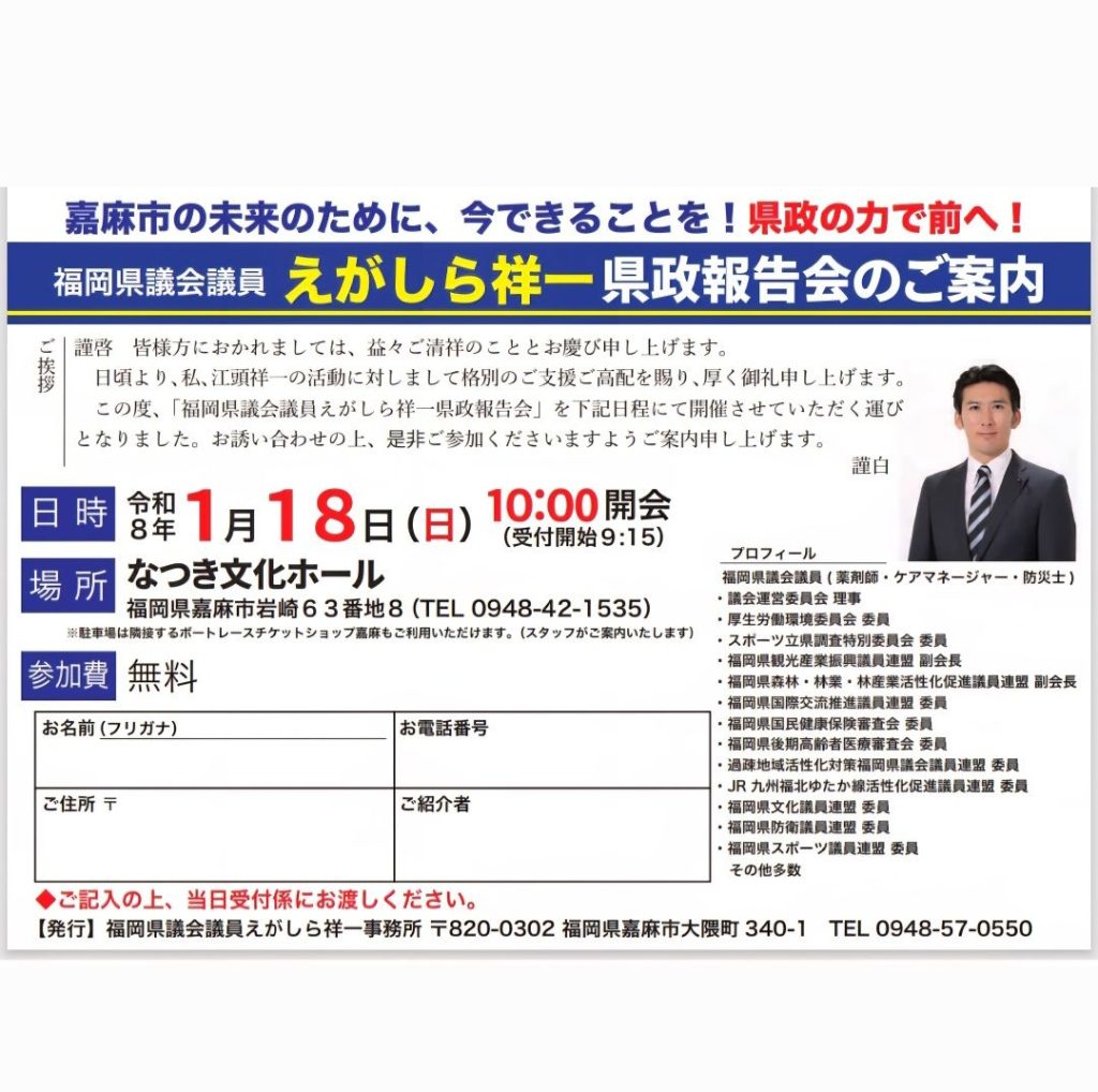 福岡県の為に、嘉麻市の為に全力中の全力で、ありとあらゆる形と方向性で県政に取り組まさせていただいております。
